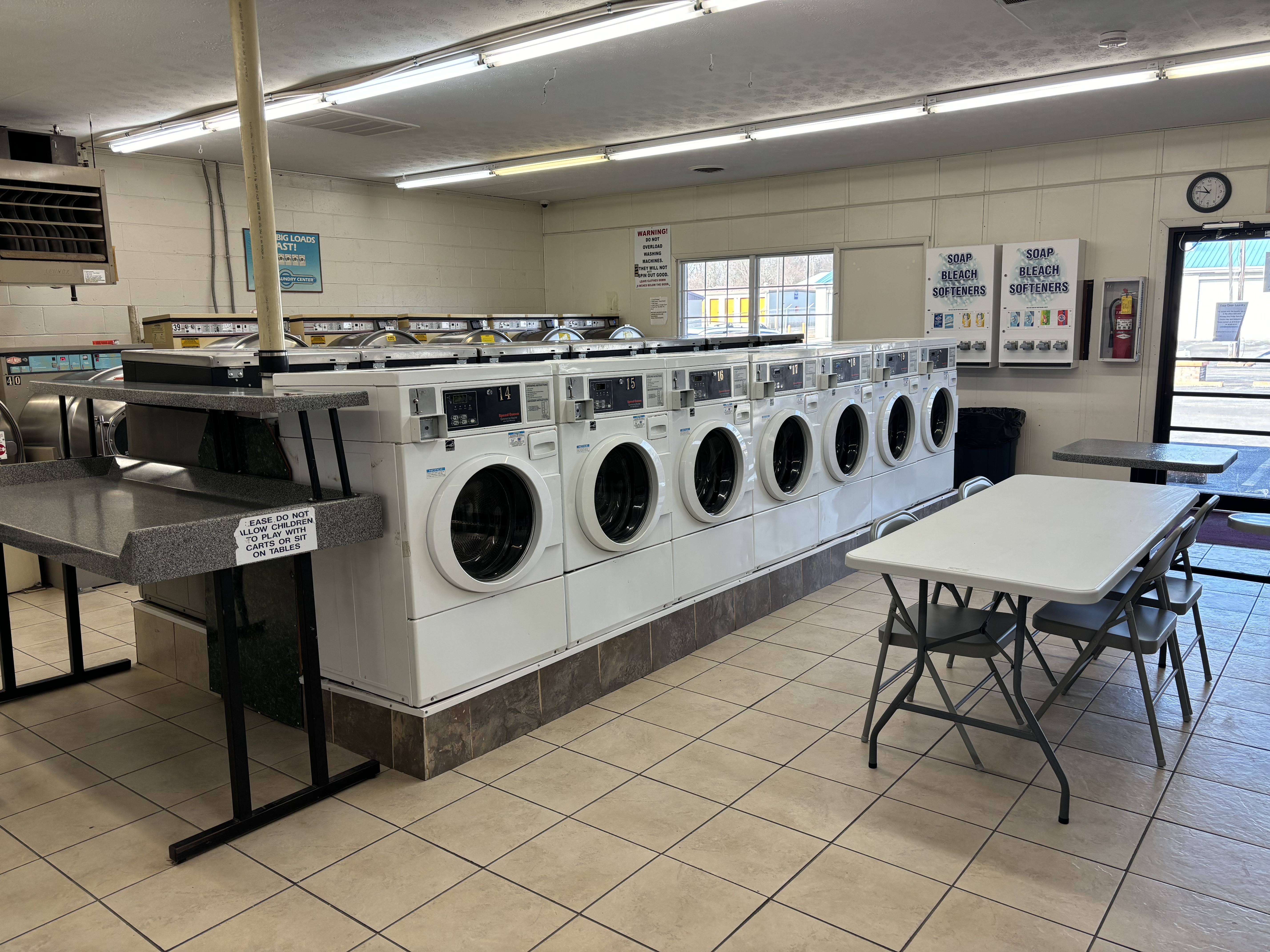 Here we have an assortment of 34 washers that can handle between 20 and 60 lbs of dirty laundry and 22 Dryers available to make sure your clothes are dry.